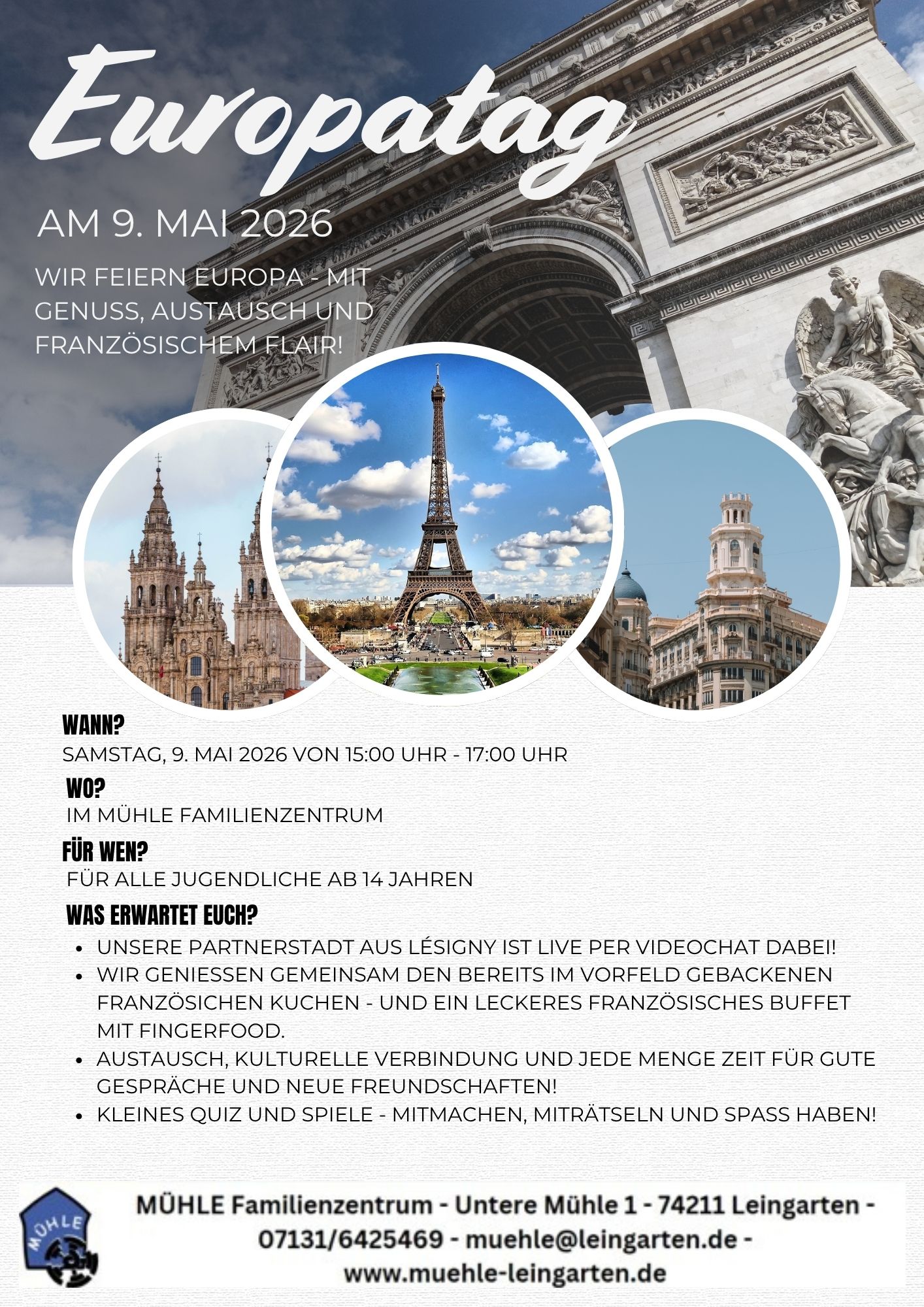 Das MÜHLE Familienzentrum ist eine durch die Stadt finanzierte Einrichtung. Neben der offenen Kinder- und Jugendarbeit, bei der alle Kinder und Jugendlichen der Stadt Leingarten an offenen Angeboten teilnehmen können (Montag bis Freitag 15:00 Uhr bis 21:00 Uhr und Samstag je nach Aktion), übernimmt das Team die Betreuung der Ganztagsschule an der Eichbottschule und an der Hans-Sauter-Schule Leingarten. Zusätzlich gewährleisten die Mitarbeiter eine verlässliche Betreuung von schulpflichtigen Kindern und Jugendlichen in den Ferien (Montag bis Freitag von 7.00 Uhr bis 17.00 Uhr; mit Ausnahme der Weihnachtsferien und drei Wochen in den Sommerferien). Auch die Schulsozialarbeiter beider Schulen sind im MÜHLE Familienzentrum angesiedelt.